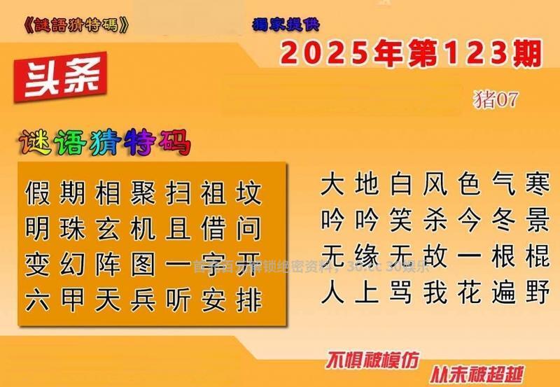 123期六合头条【解迷语猜特码】 假期相聚扫祖坟 明珠玄机且借问 变幻阵图一字开 六甲天兵听安排 解译:龙。龙在中国传统文化中象征着权威与力量,能够变幻莫测,且常常与天庭、天兵等神话元素相联系 九肖:羊猴龙鼠虎兔鸡猪蛇 六肖:羊猴龙鼠虎兔 三肖:羊猴龙 一肖:羊 |